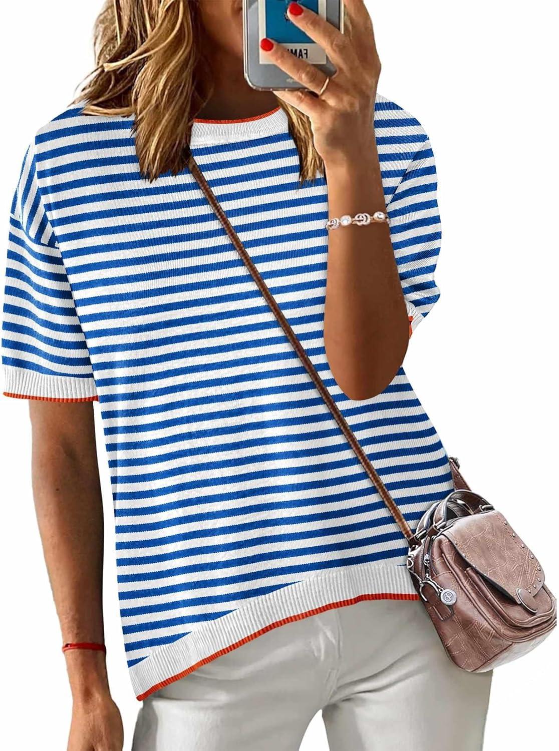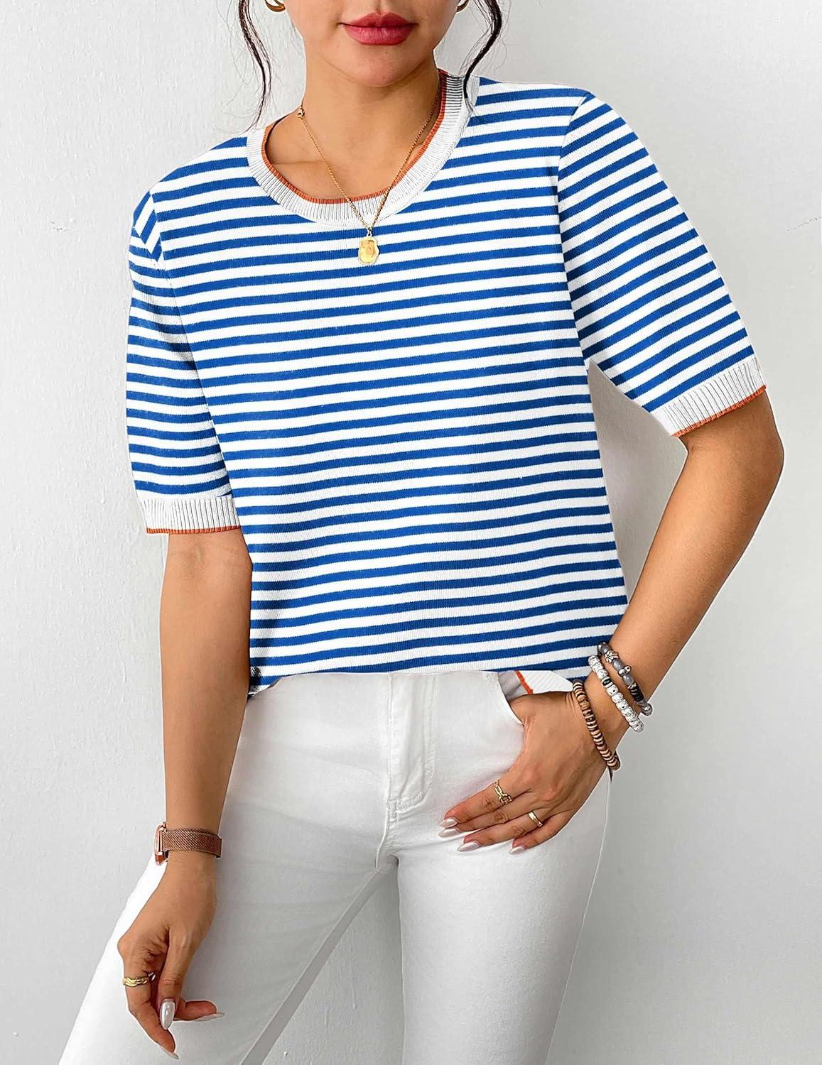 Zeagoo Womens Summer Short Sleeve Tops Crew Neck Lightweight Pullover Sweaters Loose Dressy Casual Blouse Basic Clothes(Striped Blue)