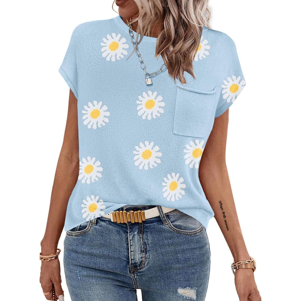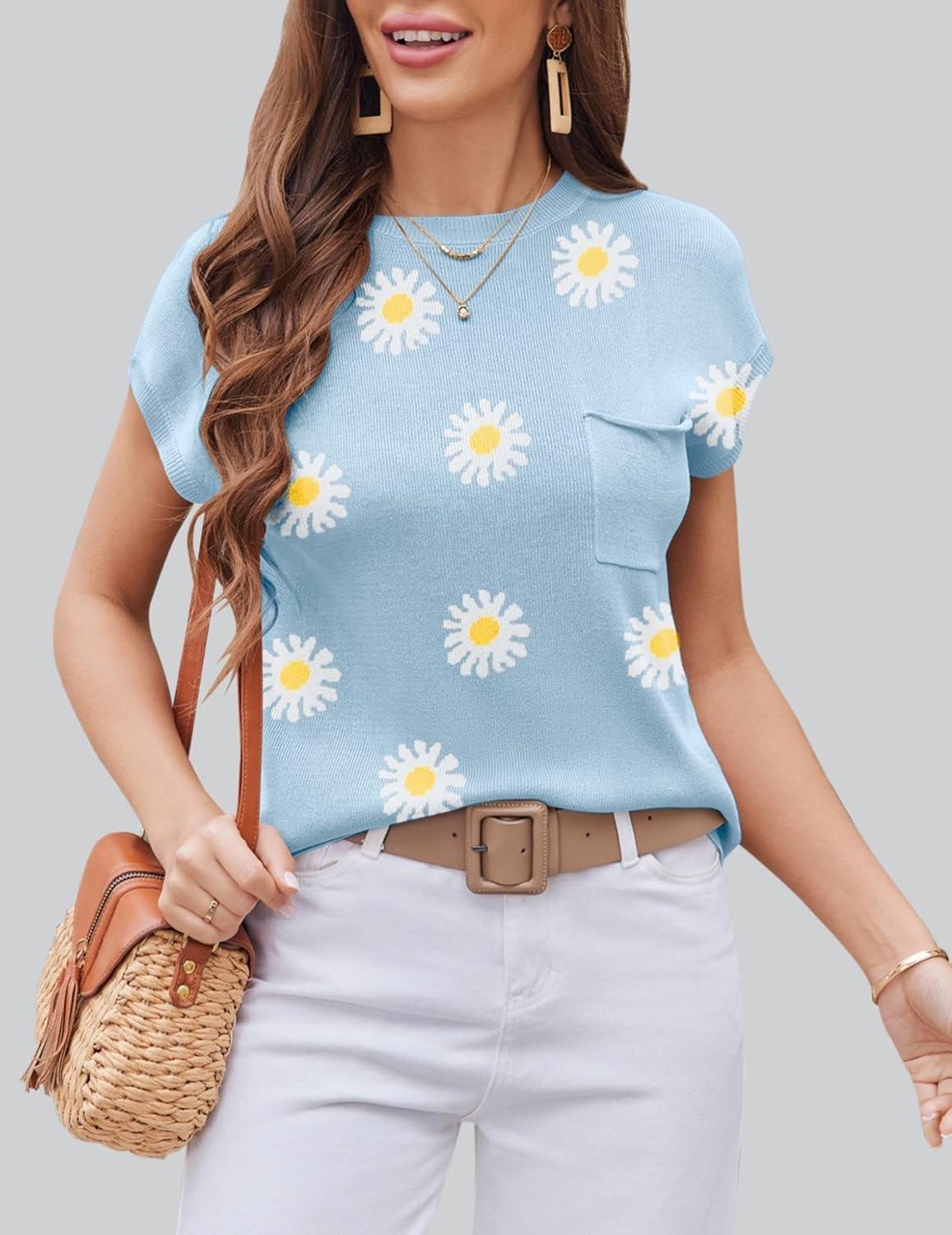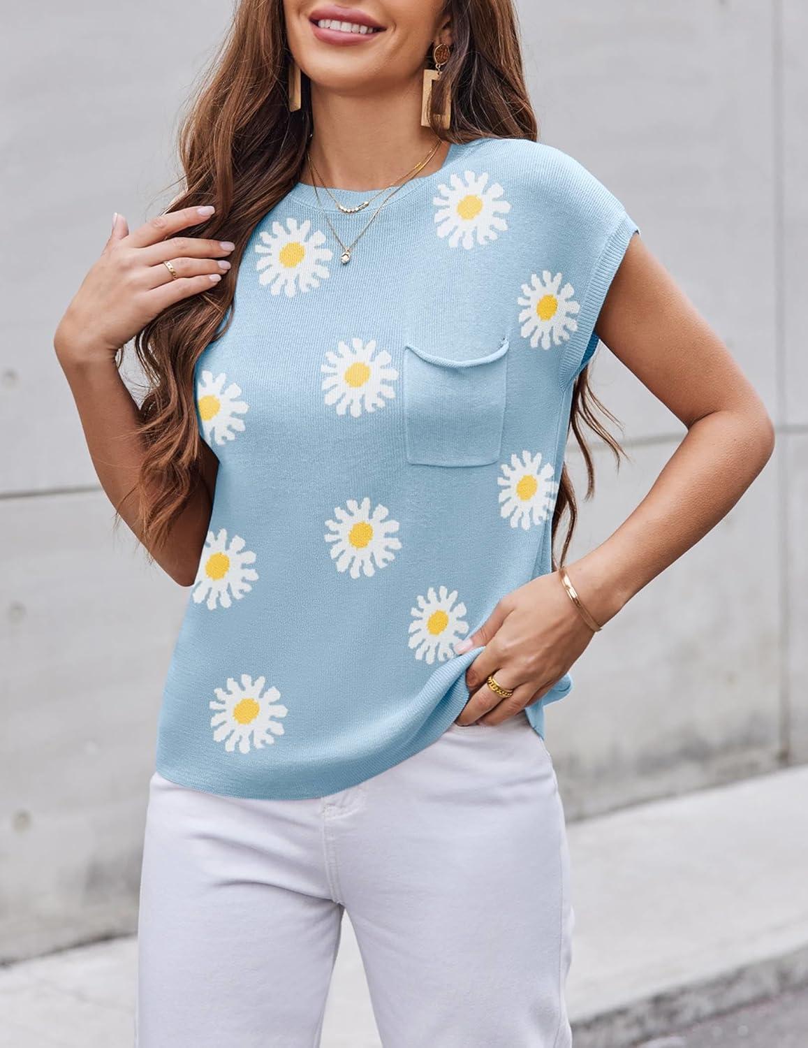 Zeagoo Womens Sweater Vest Fall 2025 Loose Fit Cape Sleeve Knit Ribbed Tank Tops with Front Pocket S-XXL(White Flower)