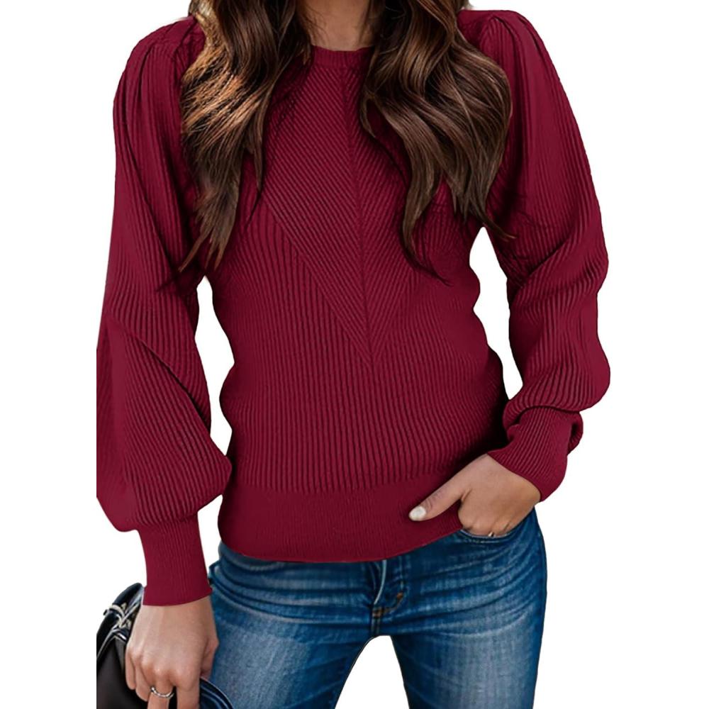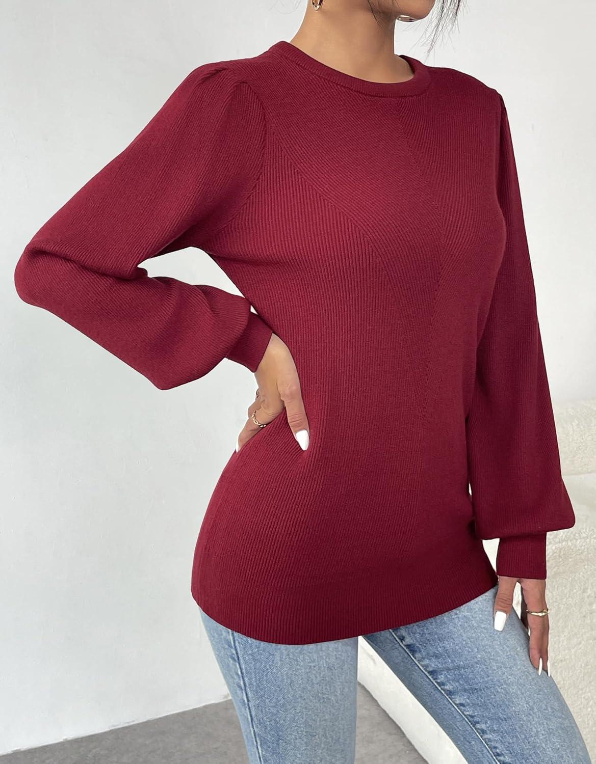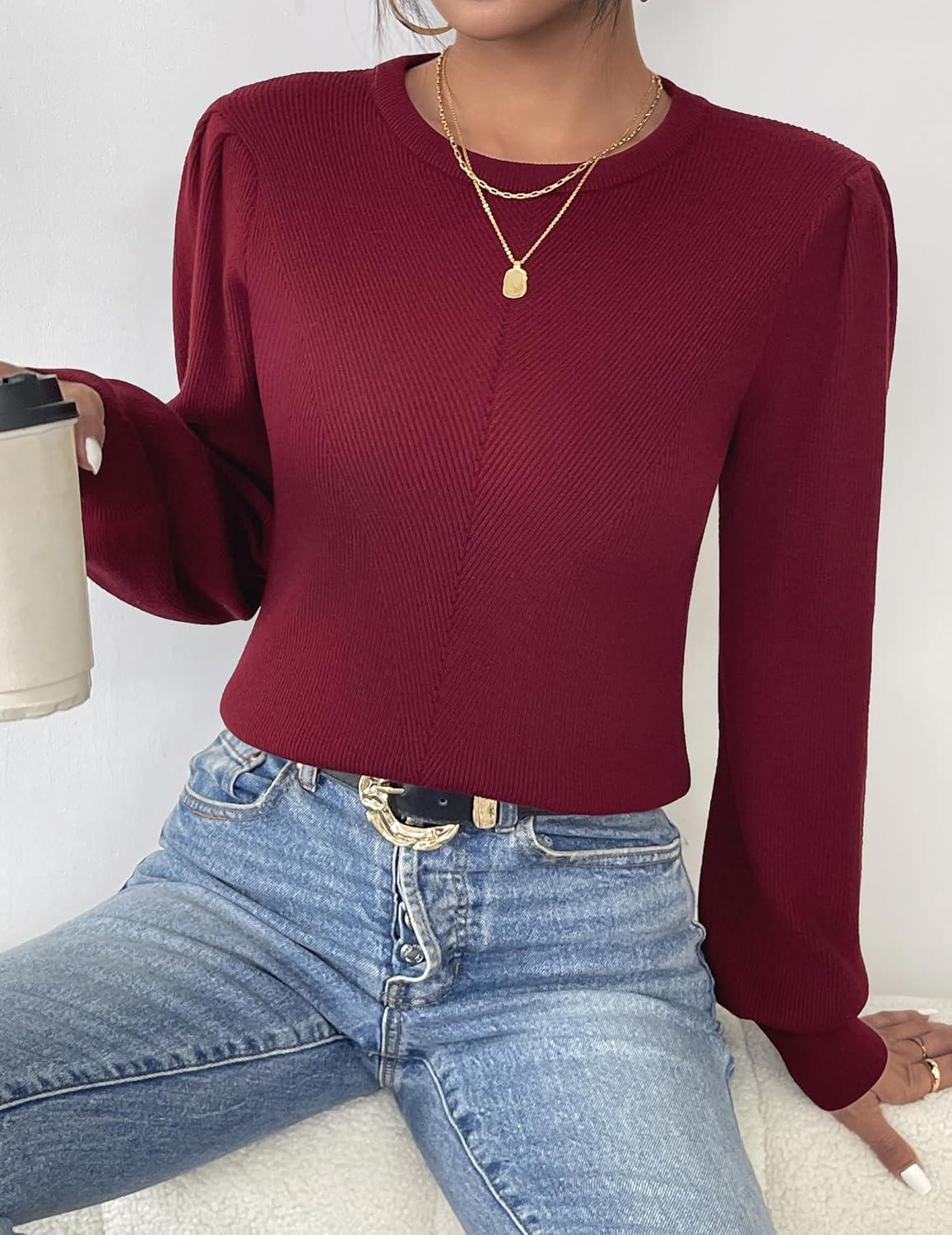 Zeagoo Womens Sweaters Fall 2025 Dressy Casual Long Sleeve Shirts Ribbed Knit Winter Outfits Puff Pullover Jumper Tops(A Red)