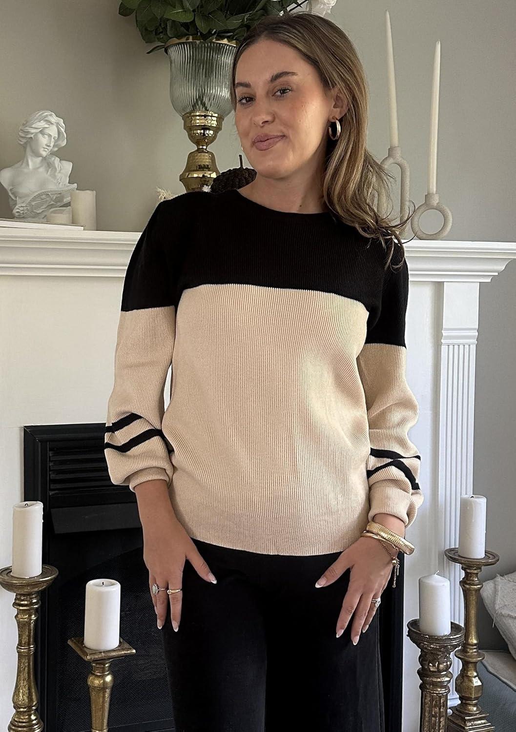 Zeagoo Womens Sweaters Fall 2025 Dressy Casual Long Sleeve Shirts Ribbed Knit Winter Outfits Puff Pullover Jumper Tops(B Black Stripe)