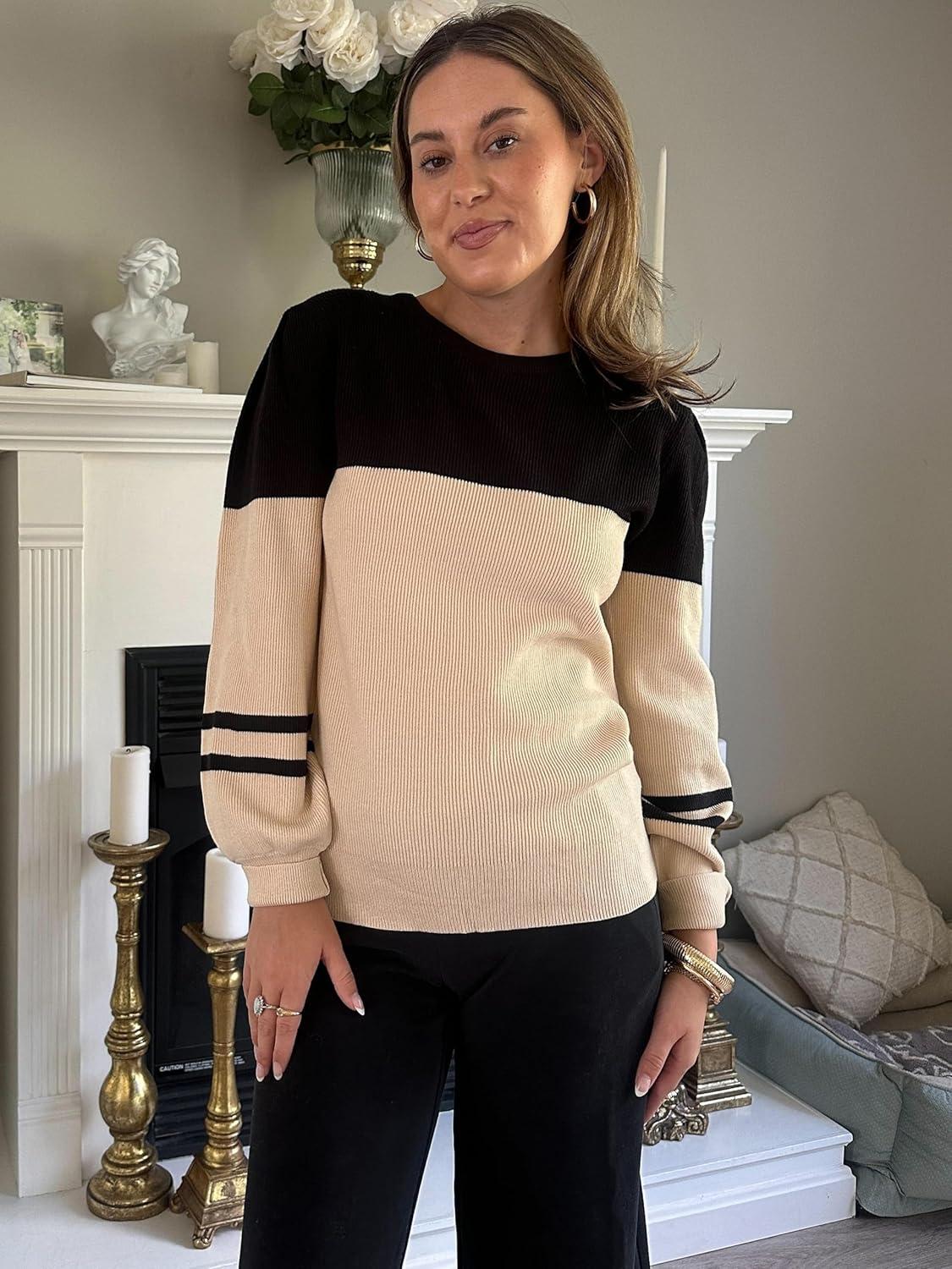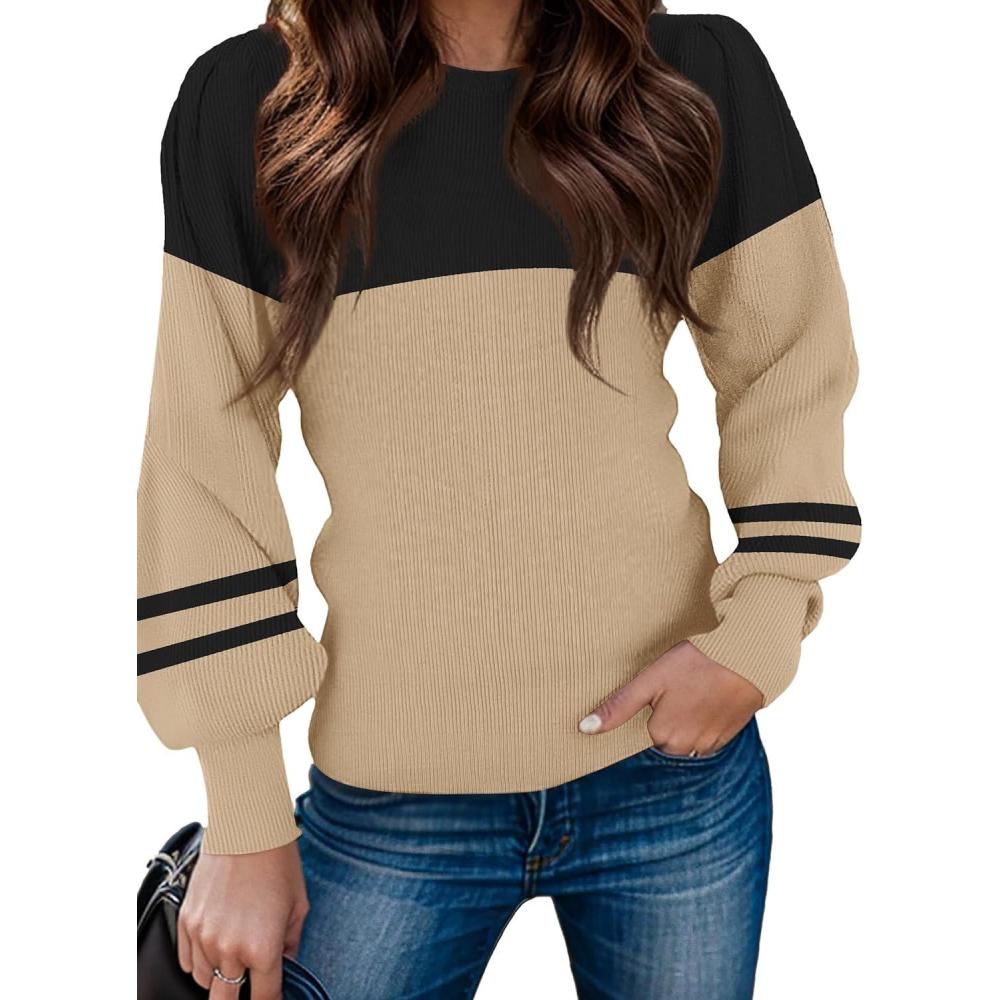 Zeagoo Womens Sweaters Fall 2025 Dressy Casual Long Sleeve Shirts Ribbed Knit Winter Outfits Puff Pullover Jumper Tops(B Apricot Black)