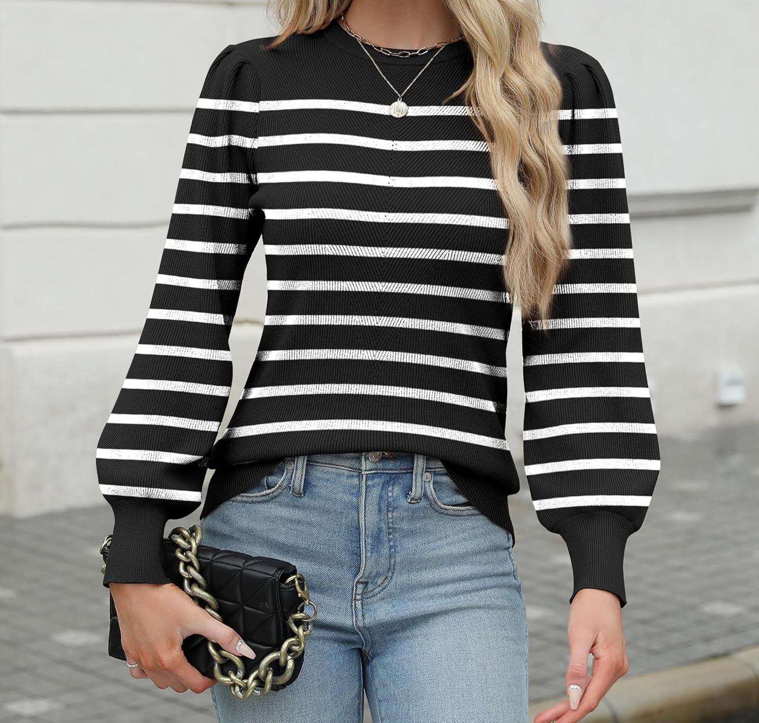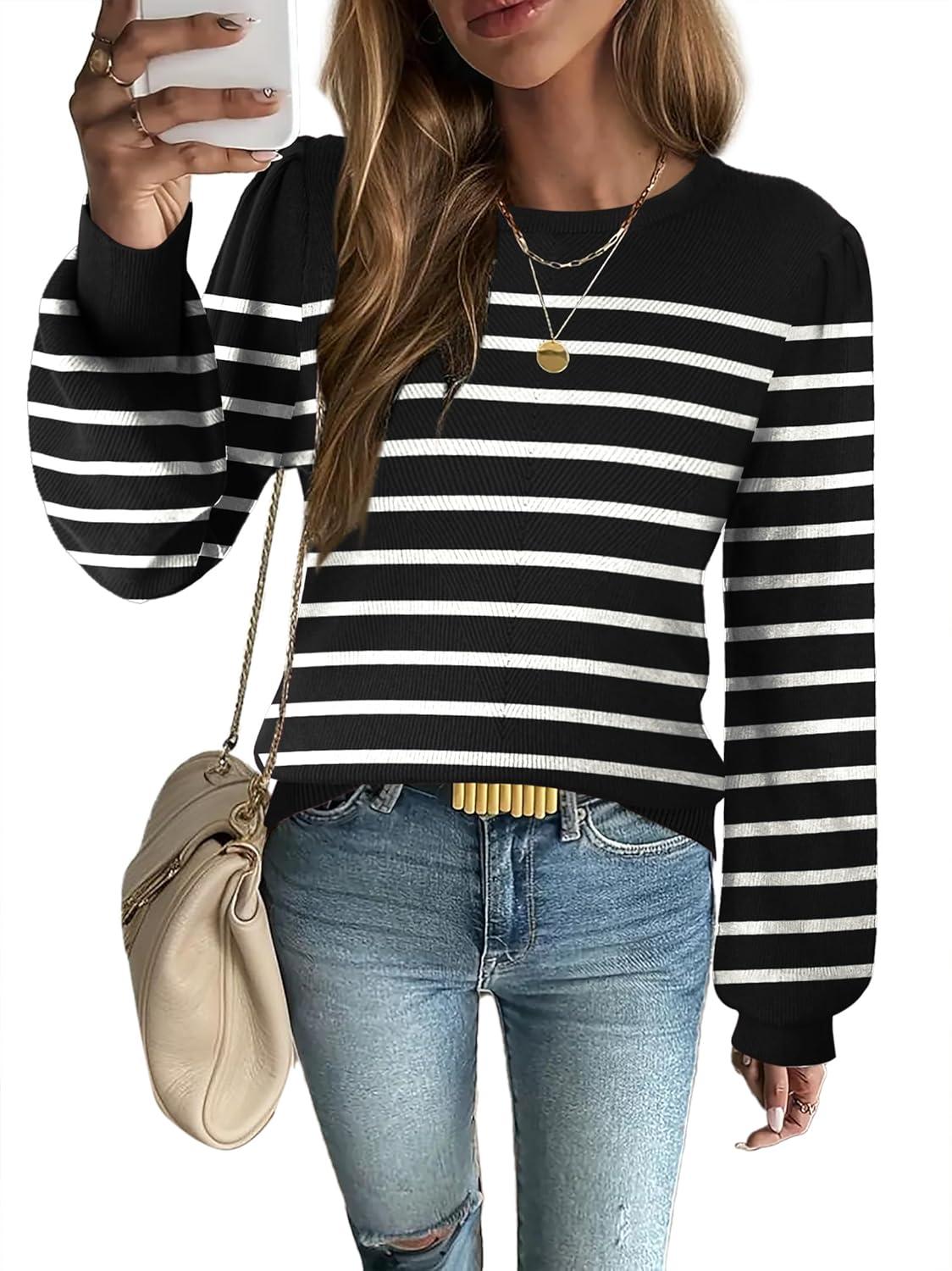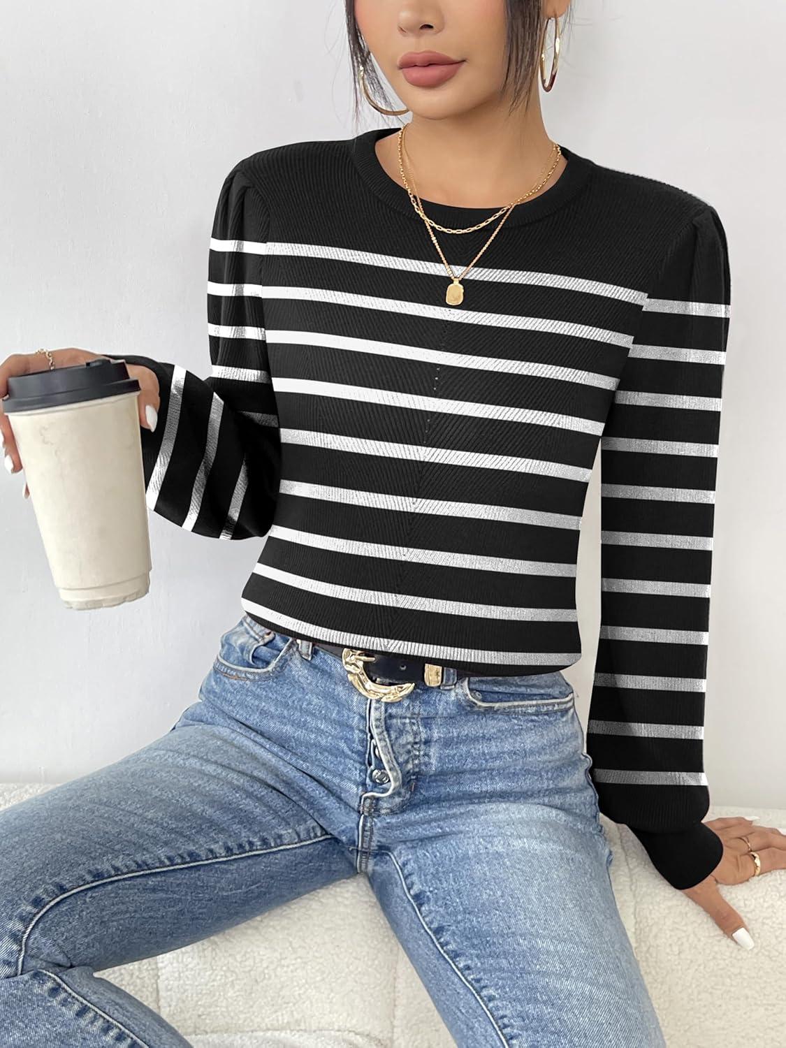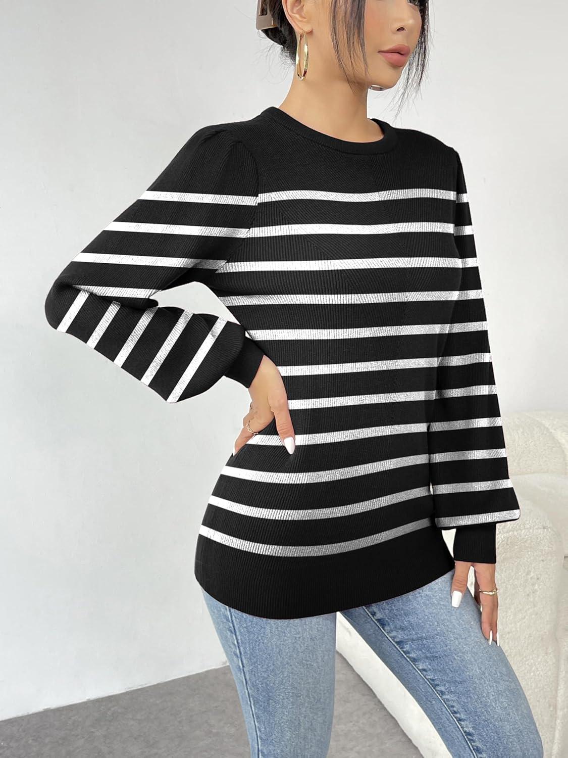 Zeagoo Womens Sweaters Fall 2025 Dressy Casual Long Sleeve Shirts Ribbed Knit Winter Outfits Puff Pullover Jumper Tops(B Black Stripe)