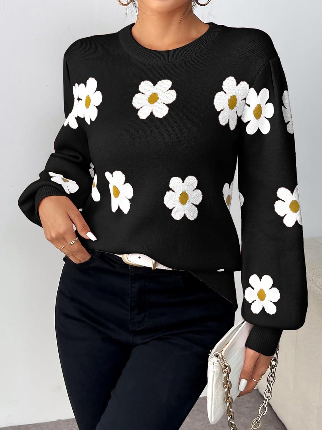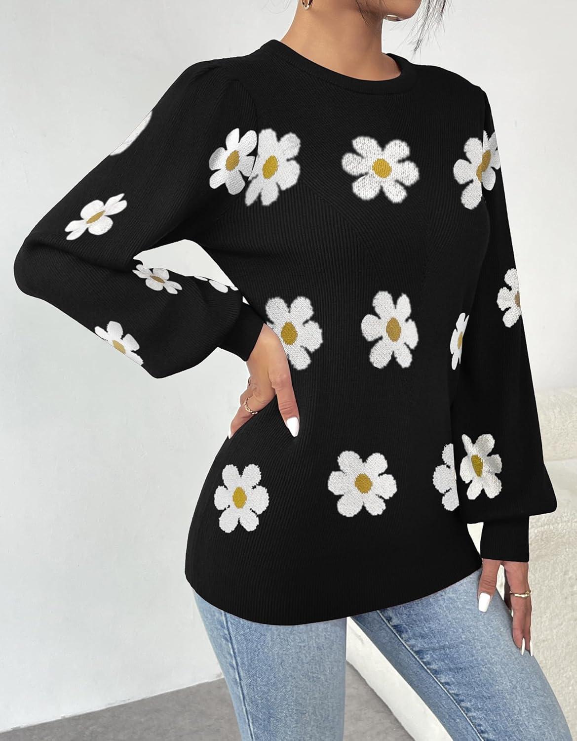 Zeagoo Womens Sweaters Fall 2025 Dressy Casual Long Sleeve Shirts Ribbed Knit Winter Outfits Puff Pullover Jumper Tops(B Floral Black)