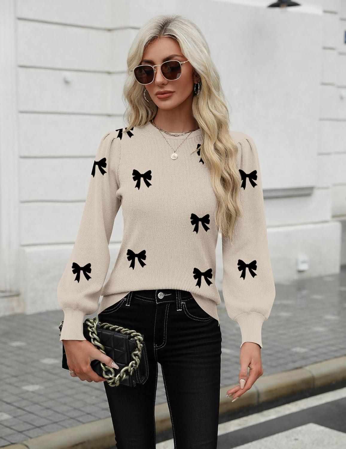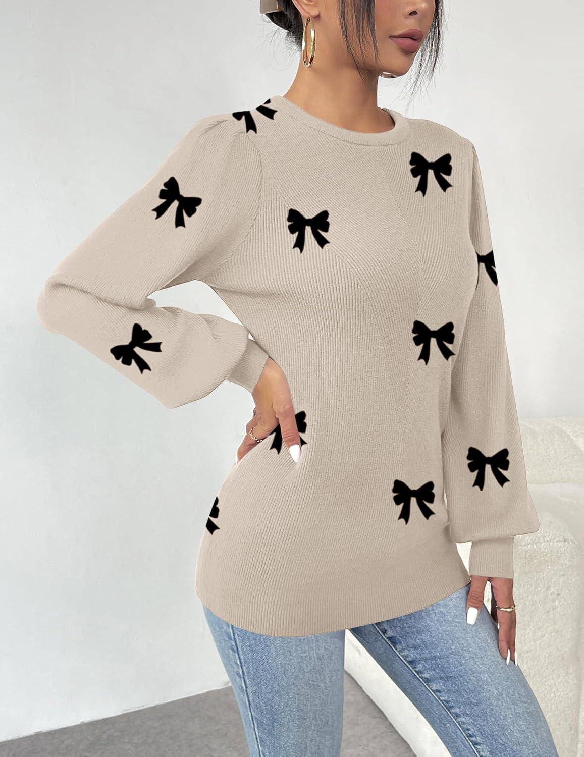 Zeagoo Womens Sweaters Fall 2025 Dressy Casual Long Sleeve Shirts Ribbed Knit Winter Outfits Puff Pullover Jumper Tops(Bowknot Apricot)