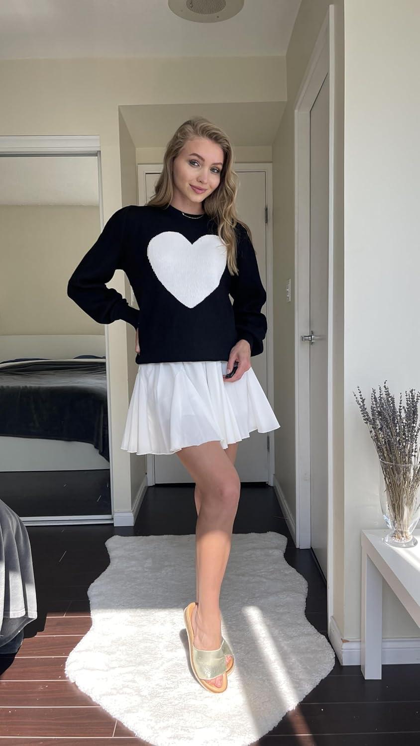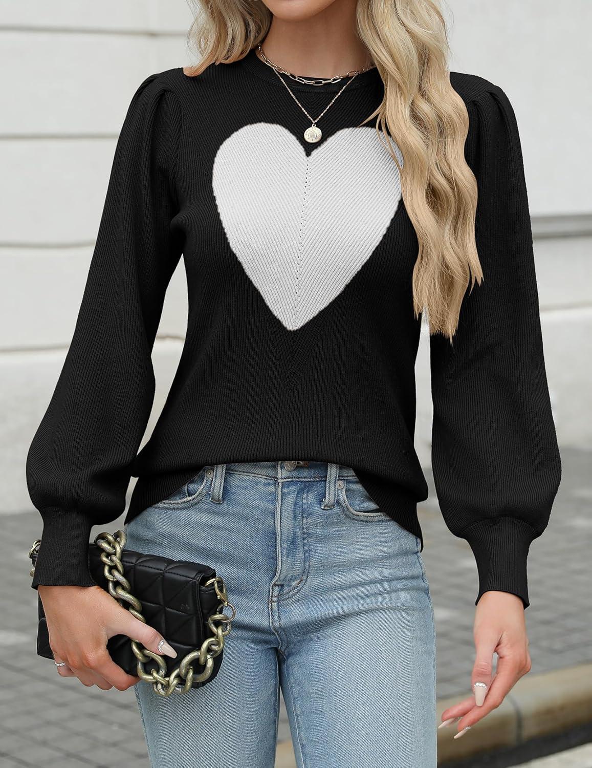 Zeagoo Womens Sweaters Fall 2025 Dressy Casual Long Sleeve Shirts Ribbed Knit Winter Outfits Puff Pullover Jumper Tops(C Black White Heart)