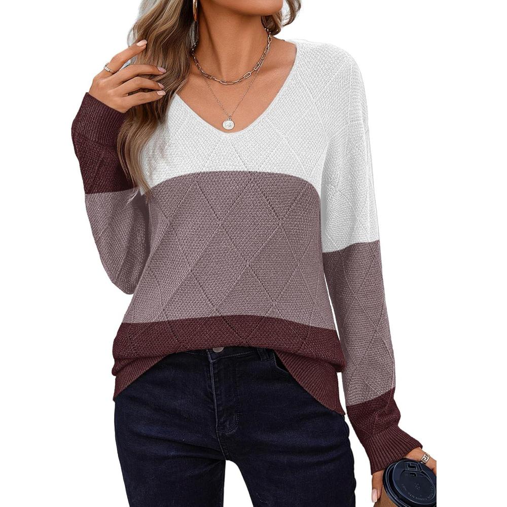 Zeagoo Womens Sweaters Fall 2025 Long Sleeve Knit Pullover V Neck Lightweight Crochet Sweater Tops Dressy Casual(Colorblock Jh284)