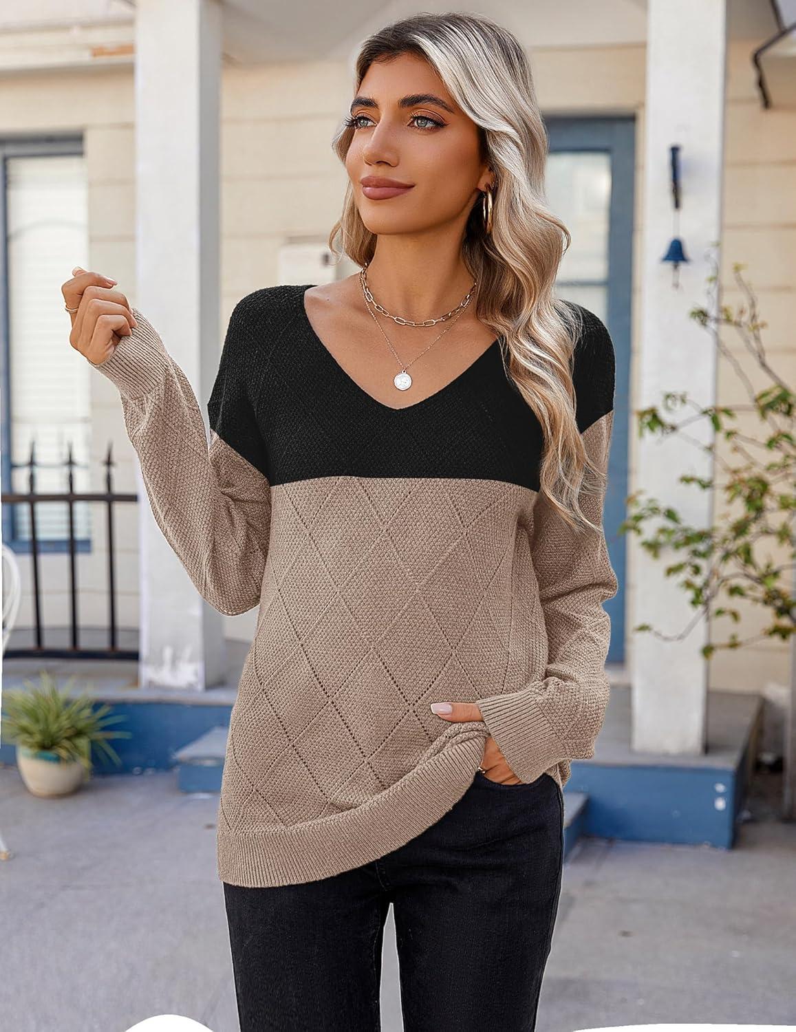 Zeagoo Womens Sweaters Fall 2025 Long Sleeve Knit Pullover V Neck Lightweight Crochet Sweater Tops Dressy Casual(Colorblock Jh284)