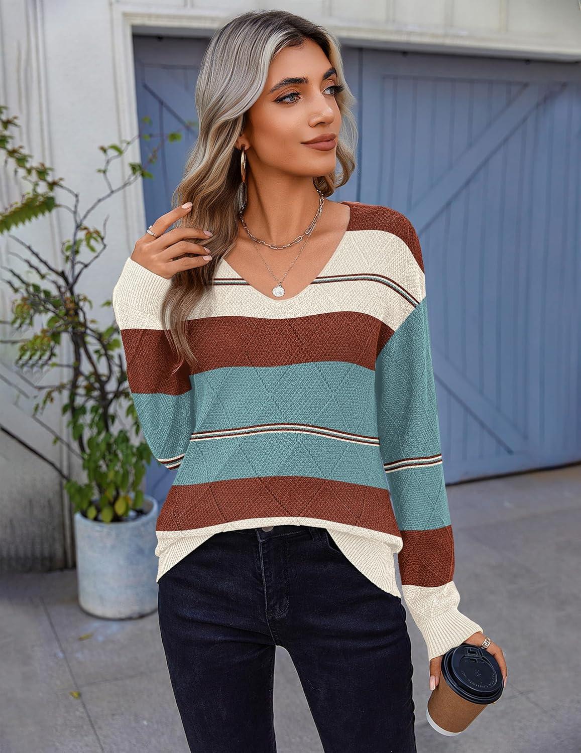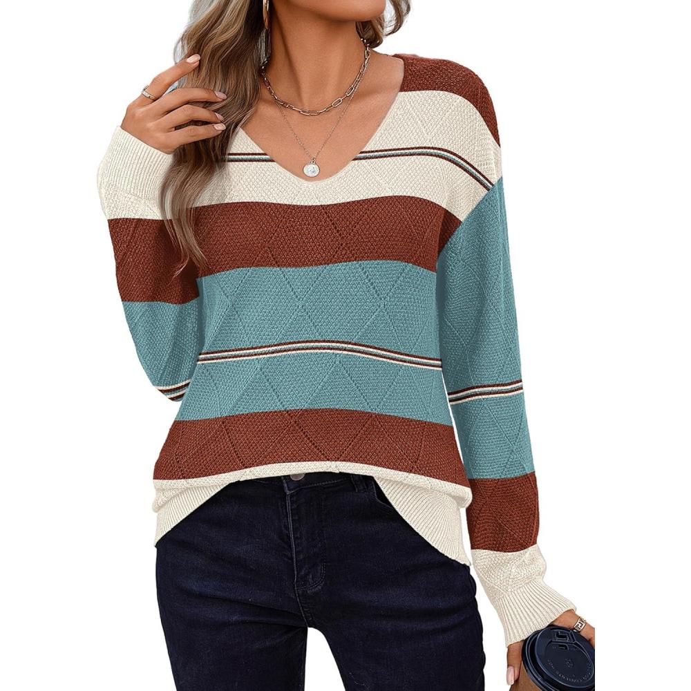 Zeagoo Womens Sweaters Fall 2025 Long Sleeve Knit Pullover V Neck Lightweight Crochet Sweater Tops Dressy Casual(Colorblock Jh537)