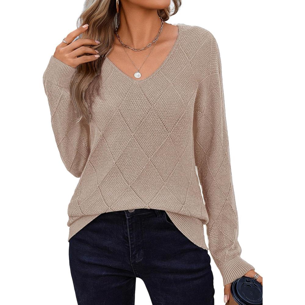 Zeagoo Womens Sweaters Fall 2025 Long Sleeve Knit Pullover V Neck Lightweight Crochet Sweater Tops Dressy Casual(Khaki)