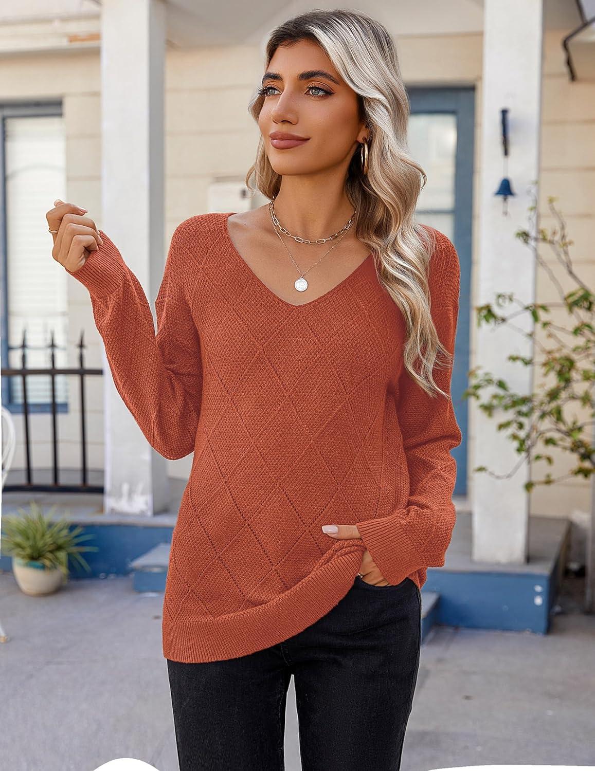 Zeagoo Womens Sweaters Fall 2025 Long Sleeve Knit Pullover V Neck Lightweight Crochet Sweater Tops Dressy Casual(Rust Brown)