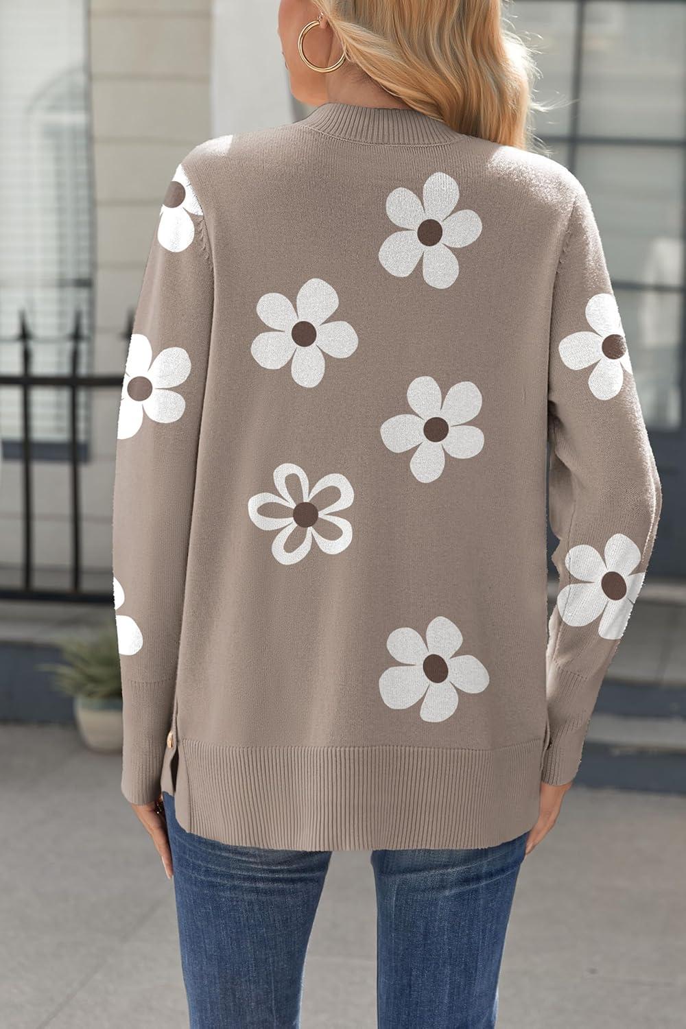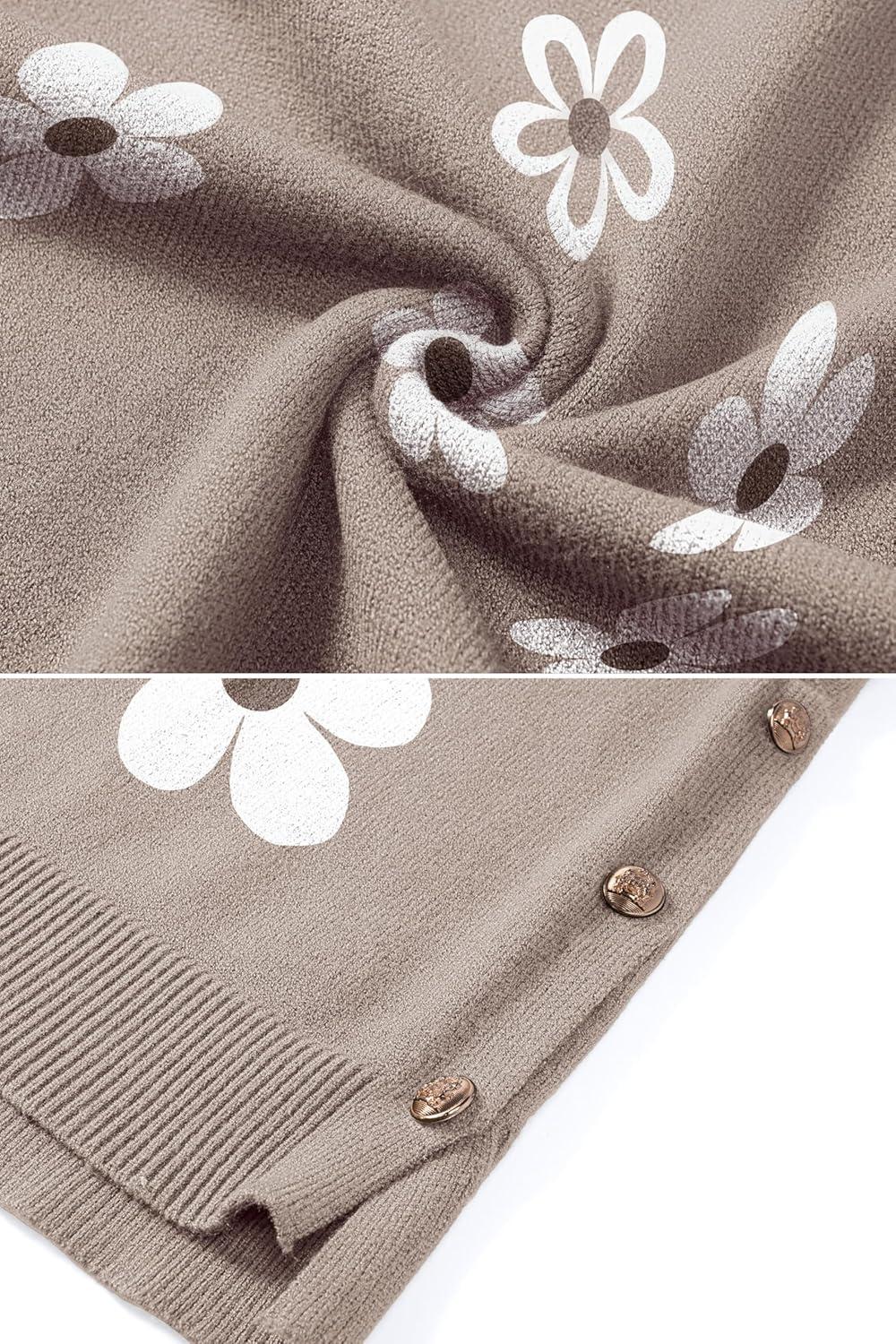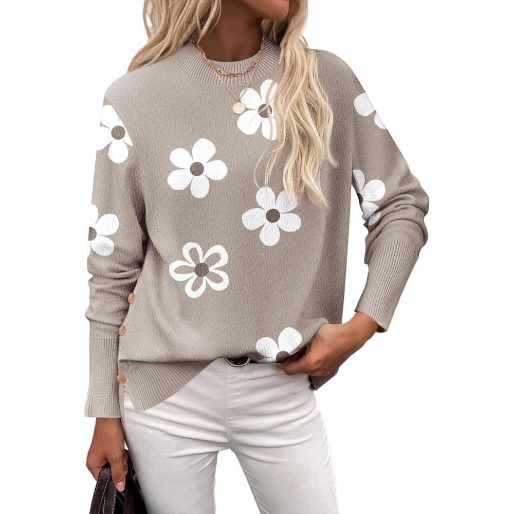 Zeagoo Women’s Sweaters Loose Knit Side Button 2025 Fall Fashion Trendy Casual Pullover Tops Clothes(Khaki Flower)