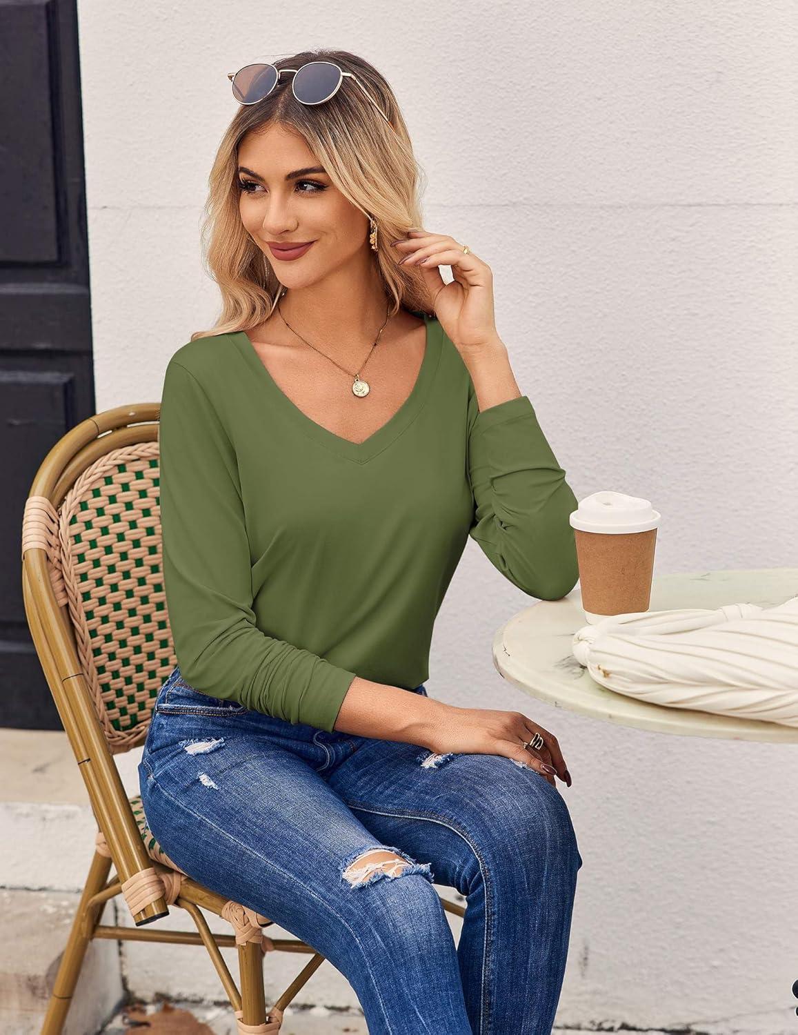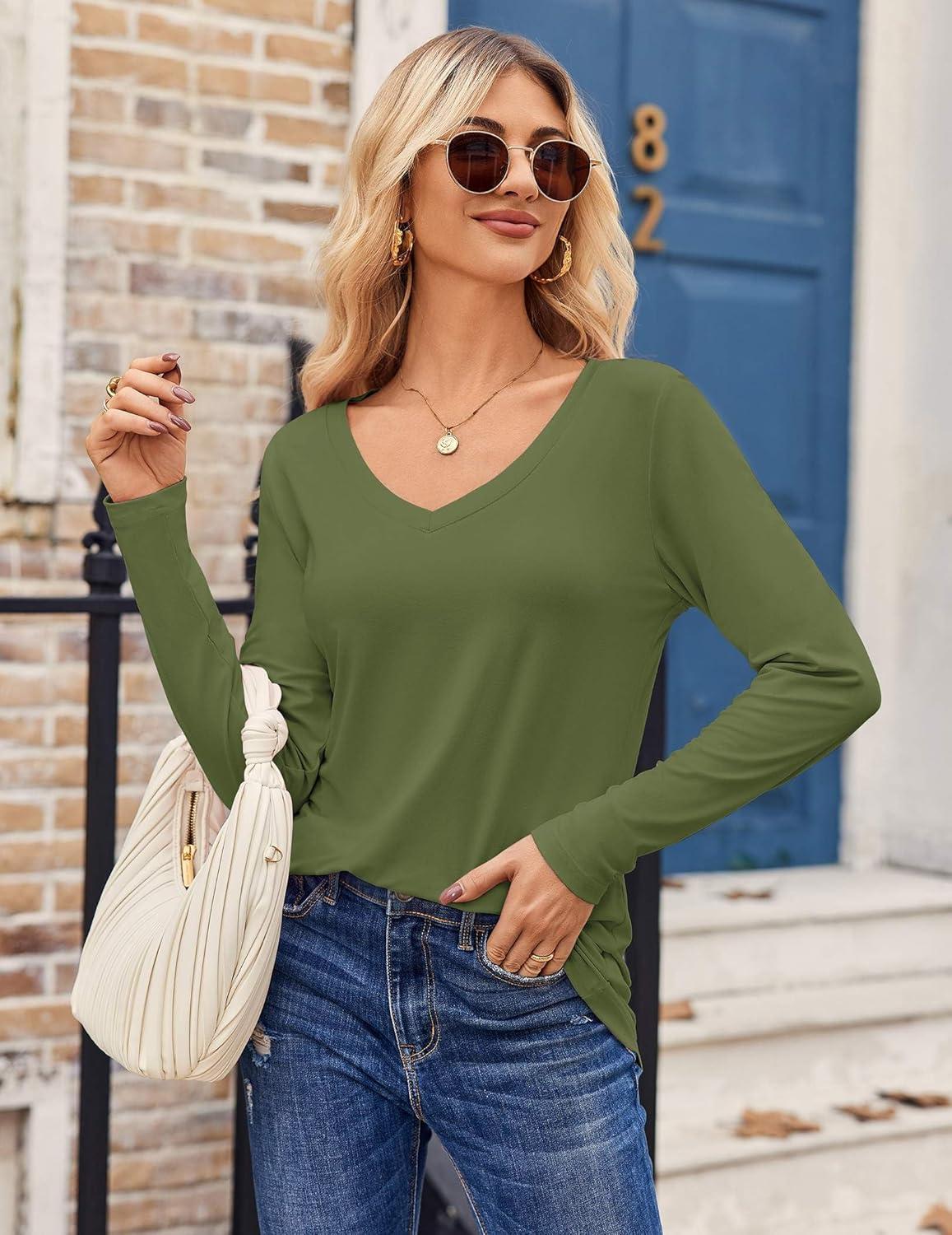 Zeagoo Womens T Shirts Long Sleeve V Neck Basic Tee Casual Loose Fit Soft Fall Tops Outfits 2025 S-XXL(Army Green)