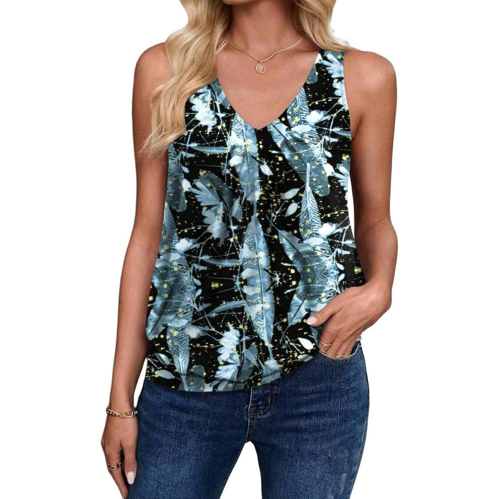Zeagoo Womens Tank Tops Loose Fit V Neck Ruched Sleeveless Tops Casual Basic Banded Shirts S-XXL(Black Blue Yellow Printed)