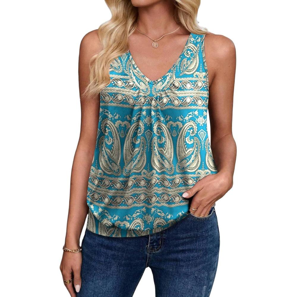 Zeagoo Womens Tank Tops Loose Fit V Neck Ruched Sleeveless Tops Casual Basic Banded Shirts S-XXL(Navy Black Red Flower)