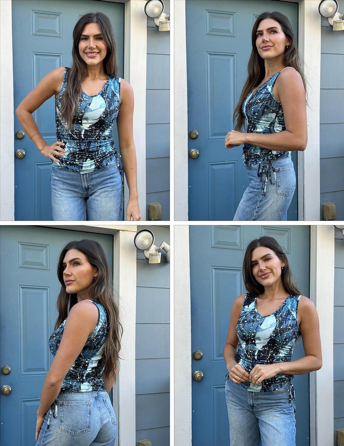 Zeagoo Womens Tank Tops Summer Ruched Top V Neck Sleeveless Drawstring Side Casual Trendy Shirts 2025(P-cadetblue)