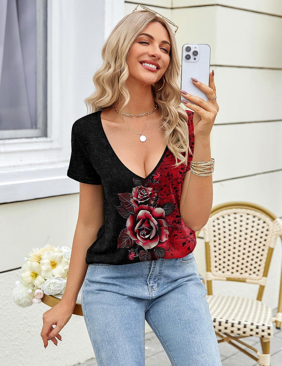 Zeagoo Womens Tops Deep V Neck Shirts Summer Low Cut Top Sexy Short Sleeve Tshirts Trendy Clothes Fashion Clothing S-3XL(Bf290 Boho)