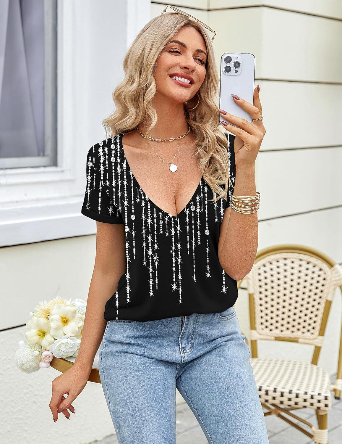 Zeagoo Womens Tops Deep V Neck Shirts Summer Low Cut Top Sexy Short Sleeve Tshirts Trendy Clothes Fashion Clothing S-3XL(Mz779 Boho)