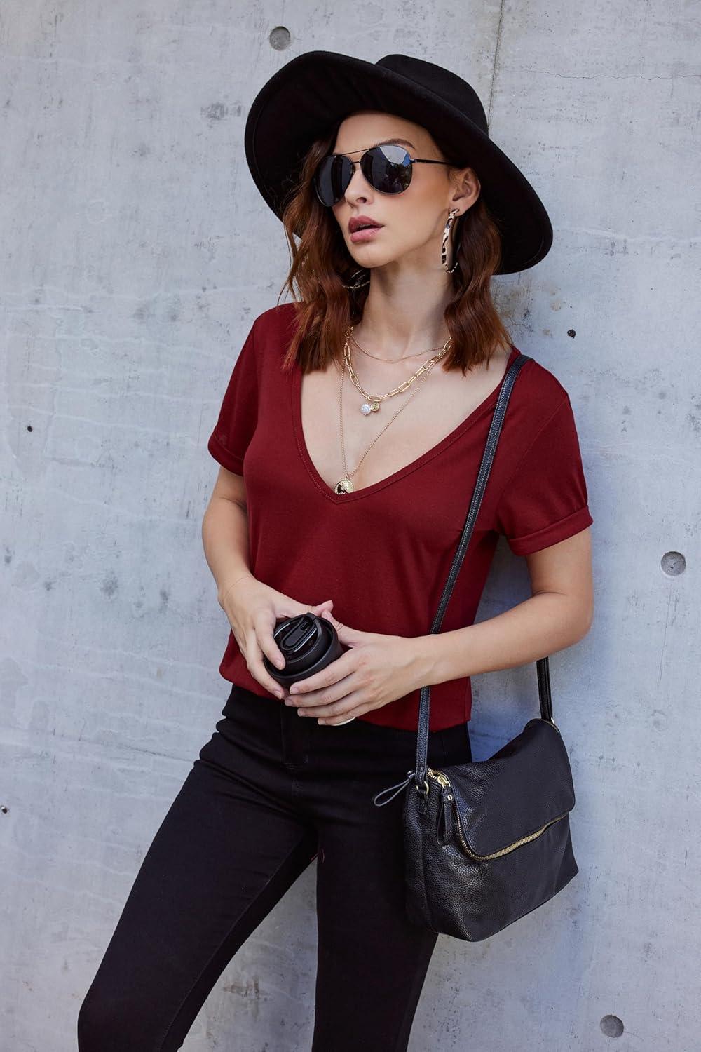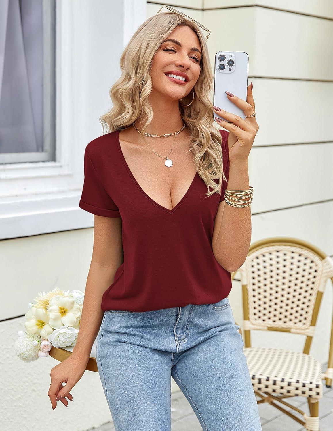Zeagoo Womens Tops Deep V Neck Shirts Summer Low Cut Top Sexy Short Sleeve Tshirts Trendy Clothes Fashion Clothing S-3XL(Wine Red)