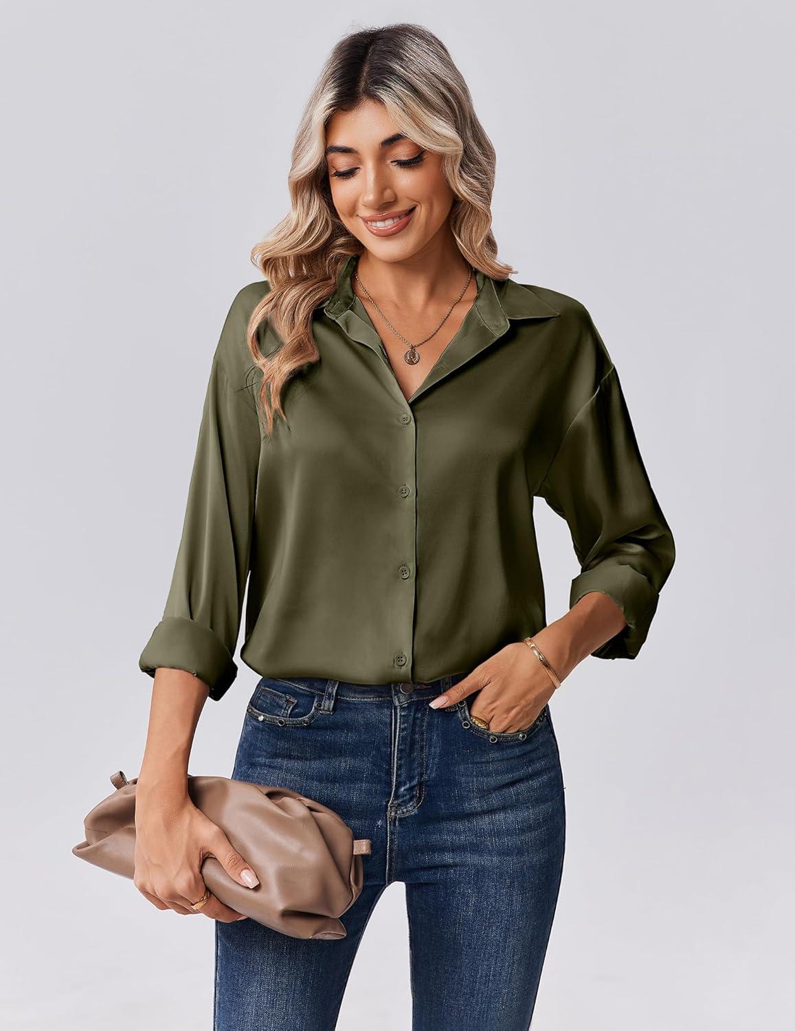 Zeagoo Womens Tops Long Sleeve Satin Silk Button Down Shirts Casual Business Dressy Blouses Fall Clothes(Army Green)