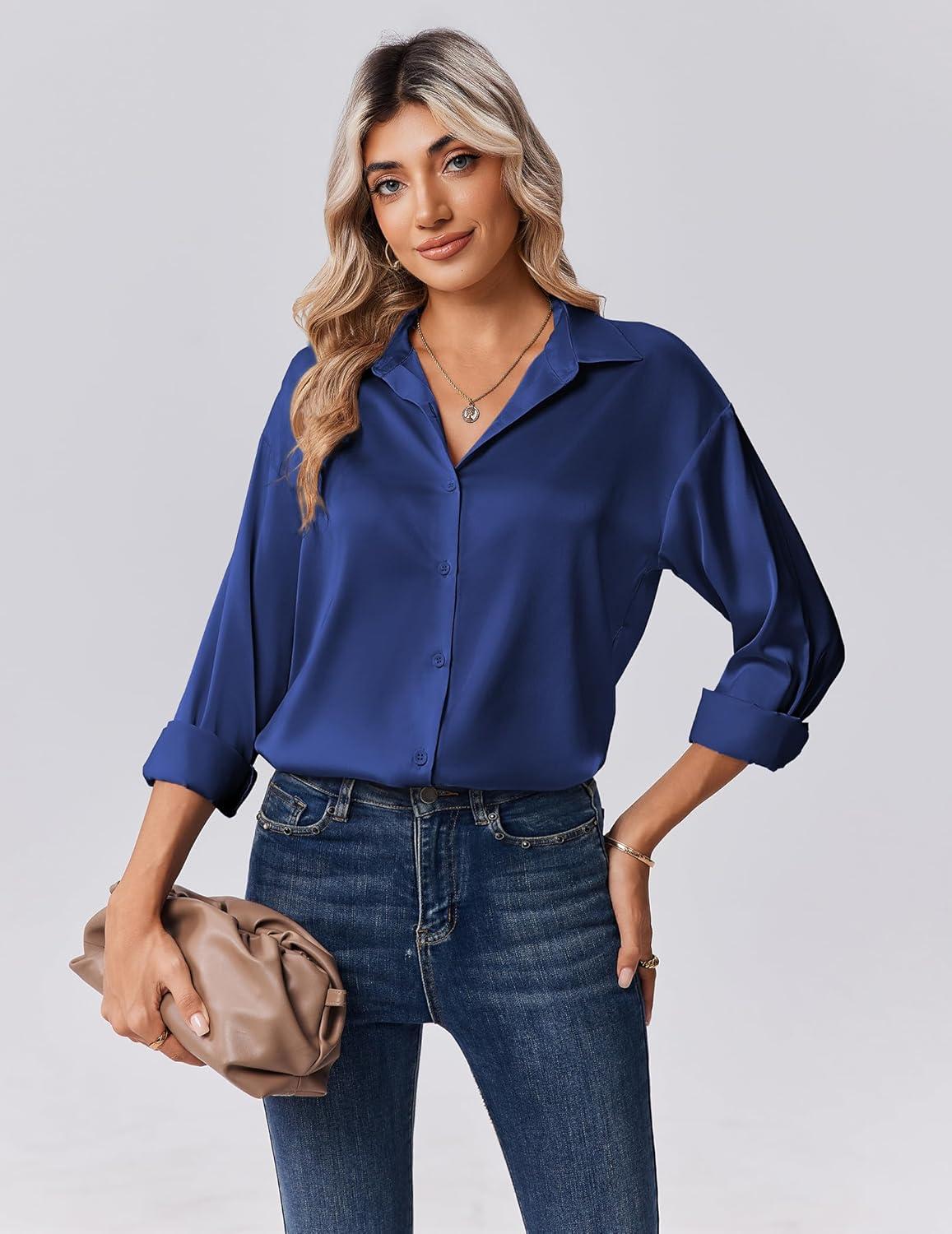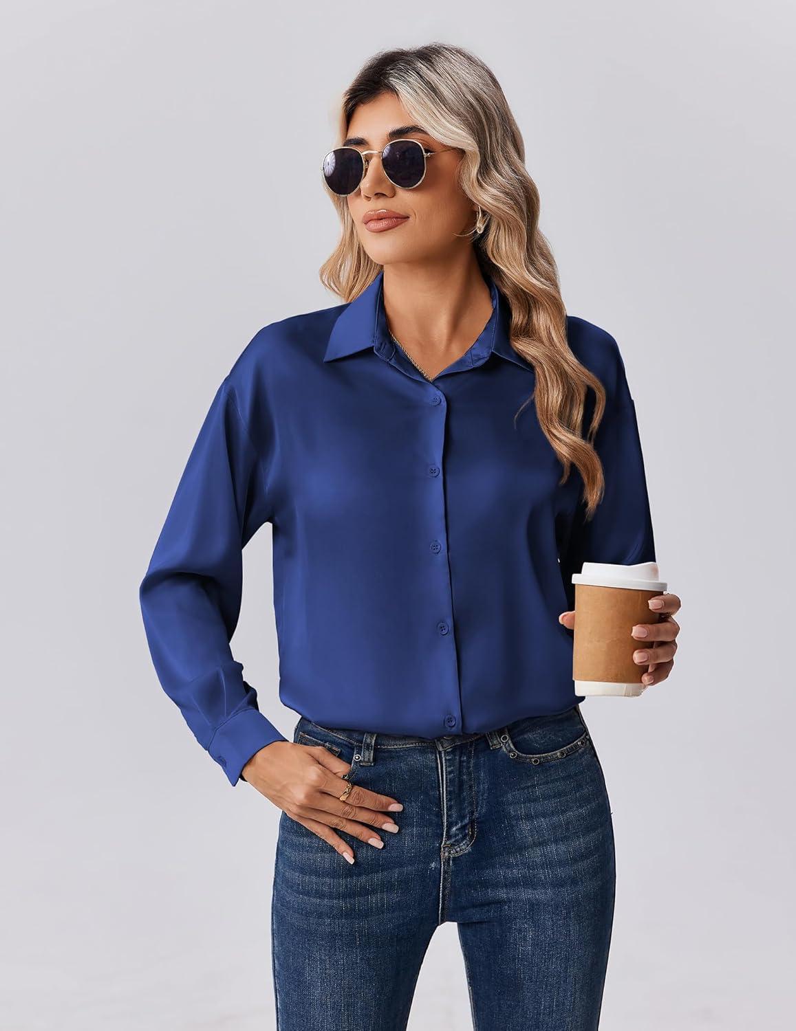 Zeagoo Womens Tops Long Sleeve Satin Silk Button Down Shirts Casual Business Dressy Blouses Fall Clothes(Navy Blue)