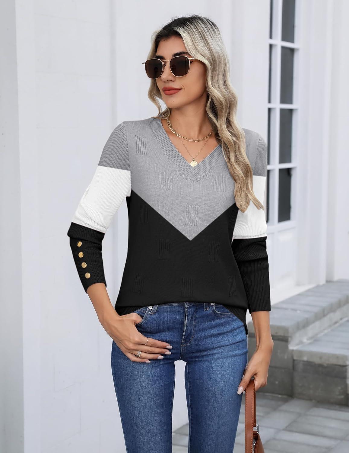 Zeagoo Womens V Neck Sweaters Shirts Long Sleeve Lightweight Ribbed Knit Pullover Sweater Blouse Tops with Buttons Oufits(C-grey Black)