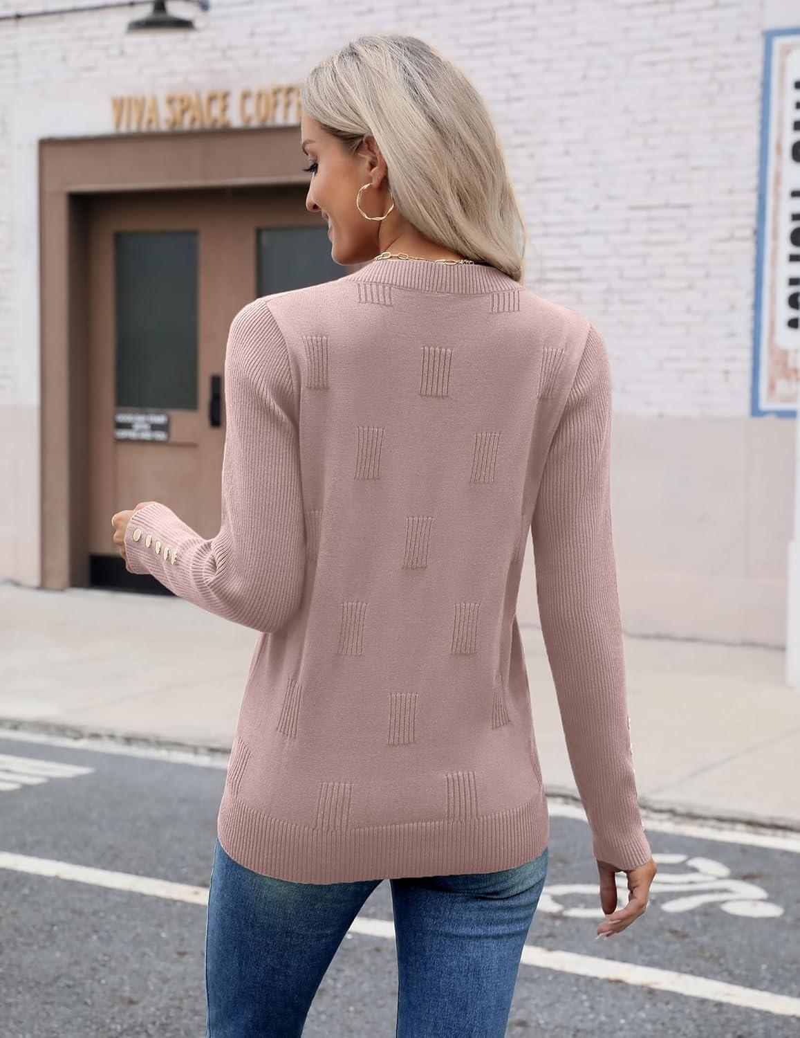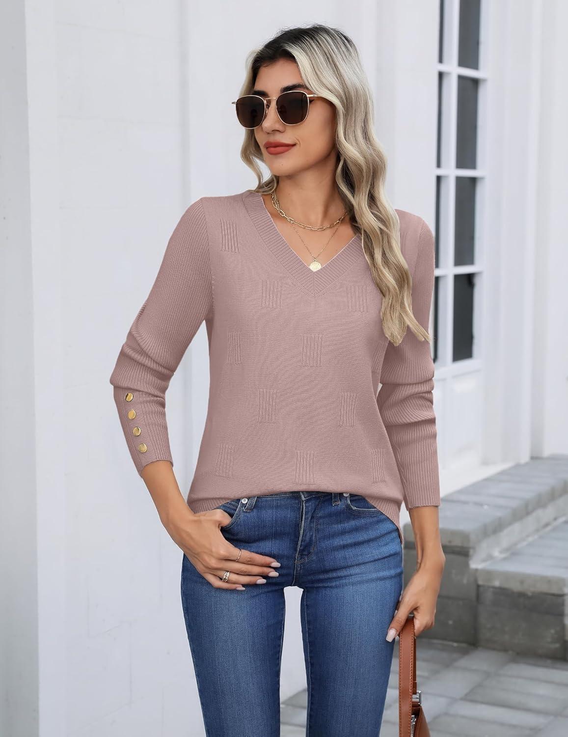 Zeagoo Womens V Neck Sweaters Shirts Long Sleeve Lightweight Ribbed Knit Pullover Sweater Blouse Tops with Buttons Oufits(Pink Purple)